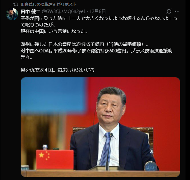 2025年12月9日 / 最終更新日 : 2025年12月9日 文明のターンテーブル ブログ 満州に残した日本の資産は約1兆5千億円(当時の貨幣価値)。対中国へODAは平成20年修了まで総額3兆6600億円。プラス技術技能援助等々。恩を仇で返す国。滅ぶしかないだろ 子供が図に乗った時に「一人で大きくなったような顔するんじゃないよ」って叱りつけたが、 現在は中国にいう言葉になった。満州に残した日本の資産は約1兆5千億円(当時の貨幣価値)。対中国へODAは平成20年修了まで総額3兆6600億円。プラス技術技能援助等々。恩を仇で返す国。滅ぶしかないだろ FacebookXBlueskyHatenaCopy コメントを残すメールアドレスが公開されることはありません。 ※ が付いている欄は必須項目ですコメント ※ 上の計算式の答えを入力してください 名前 メール サイト 次回のコメントで使用するためブラウザーに自分の名前、メールアドレス、サイトを保存する。 Δ