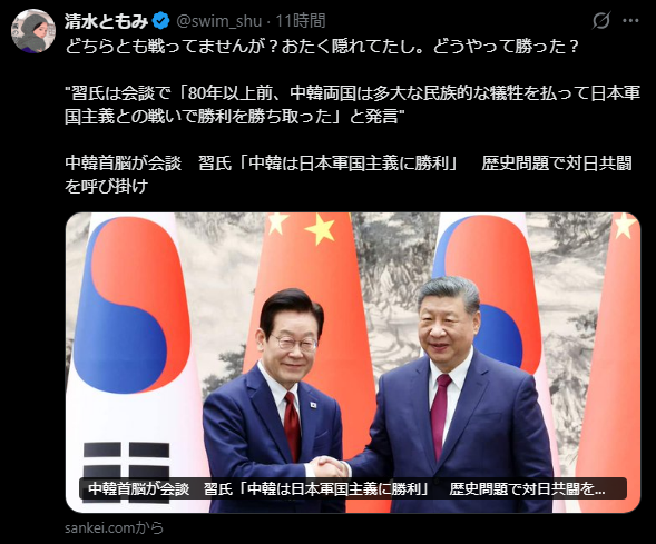 2026年1月6日 / 最終更新日 : 2026年1月6日 文明のターンテーブル ブログ どちらとも戦ってませんが?おたく隠れてたし。どうやって勝った? どちらとも戦ってませんが?おたく隠れてたし。どうやって勝った?“習氏は会談で「80年以上前、中韓両国は多大な民族的な犠牲を払って日本軍国主義との戦いで勝利を勝ち取った」と発言”中韓首脳が会談 習氏「中韓は日本軍国主義に勝利」 歴史問題で対日共闘を呼び掛け FacebookXBlueskyHatenaCopy コメントを残すメールアドレスが公開されることはありません。 ※ が付いている欄は必須項目ですコメント ※ 上の計算式の答えを入力してください 名前 メール サイト 次回のコメントで使用するためブラウザーに自分の名前、メールアドレス、サイトを保存する。 Δ