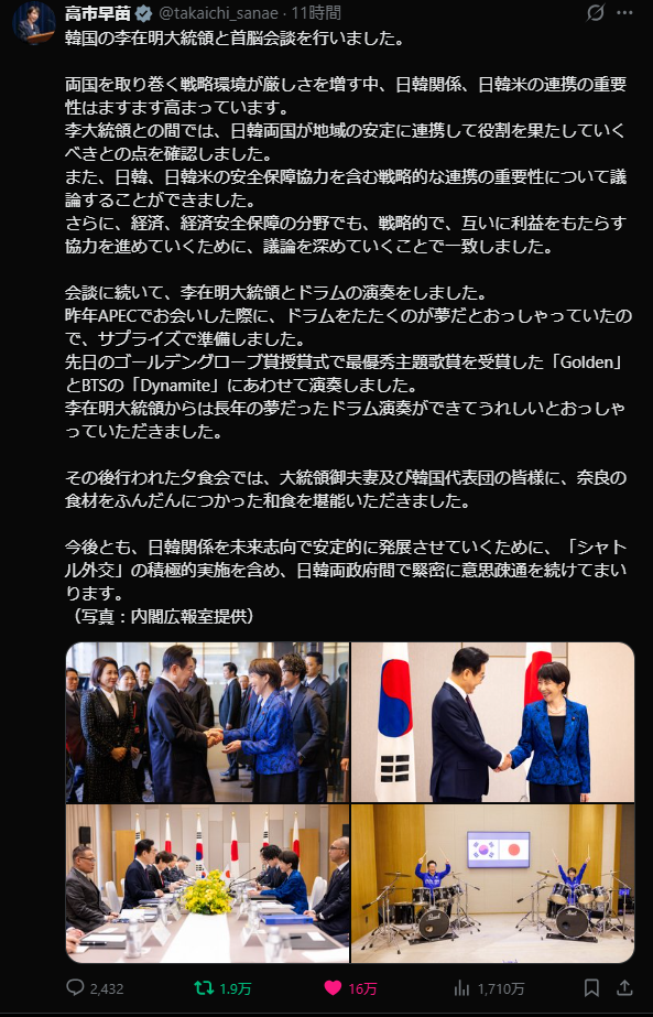 NHKの報道部は完全に腐ってる。 政府はNHKの報道部を支配している人間達を徹底的に調査せよ。 TBSの世論調査ですら高市政権支持率78%と報道している時に、今朝、NHK報道部が出して来た数字は62%なのである。 NHKの報道部は完全に中国の手先同然である事を実証しているのだから。 実際の世論がどうなのか…極言すれば、国民の90%は高市早苗=高市政権を支持しているのである。 以下の表示件数が、その事を証明している。 瞬間的であり時事であるSNSで、それも政治で、こんな凄い数字は初めて見た。 表示件数只今1592万件、しかも刻々増えている単位が万単位なのだから。 こうして書いている間にも1593万件になっているだろう。 政府は、日本国民の総意を汲んで、NHKの報道部を支配している愚劣、卑劣…今朝のニュース中の高市さんの似顔絵も酷い…習近平は笑顔+パンダ…NHKは、もはや中国国営放送局同然なのだから、視聴料を取る資格は全くない。