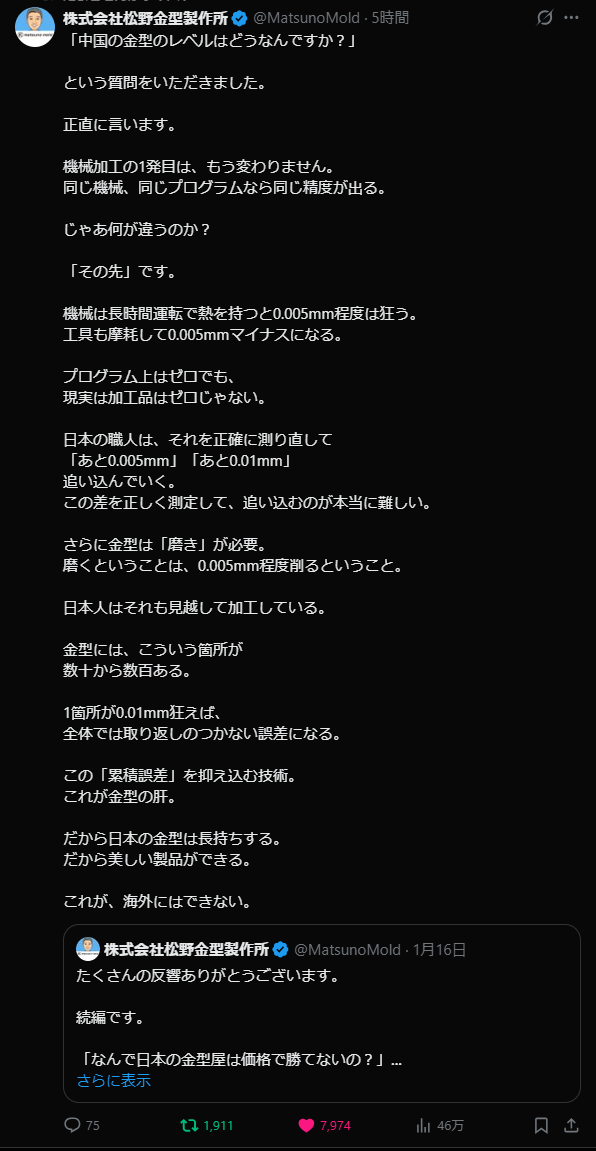 2026年1月17日 / 最終更新日 : 2026年1月17日 文明のターンテーブル ブログ だから日本の金型は長持ちする。だから美しい製品ができる。これが、海外にはできない。 FacebookXBlueskyHatenaCopy コメントを残すメールアドレスが公開されることはありません。 ※ が付いている欄は必須項目ですコメント ※ 上の計算式の答えを入力してください 名前 メール サイト 次回のコメントで使用するためブラウザーに自分の名前、メールアドレス、サイトを保存する。 Δ