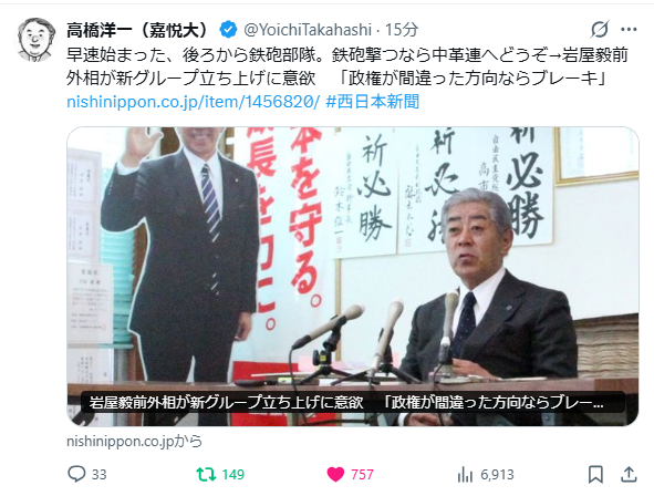ましてや岩屋等は、高市首相に対する国民の全面的、かつ、圧倒的な支持がなかったならば、落選は間違いなかった政治屋である。