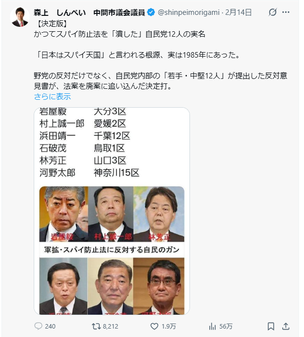 2026年2月15日 / 最終更新日 : 2026年2月15日 文明のターンテーブル ブログ かつてスパイ防止法を「潰した」自民党12人の実名 … 「日本はスパイ天国」と言われる根源、実は1985年にあった。 FacebookXBlueskyHatenaCopy コメントを残すメールアドレスが公開されることはありません。 ※ が付いている欄は必須項目ですコメント ※ 上の計算式の答えを入力してください 名前 メール サイト 次回のコメントで使用するためブラウザーに自分の名前、メールアドレス、サイトを保存する。 Δ