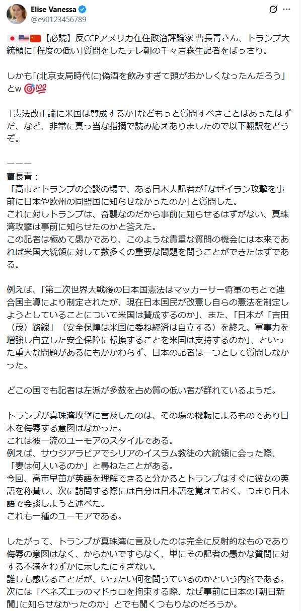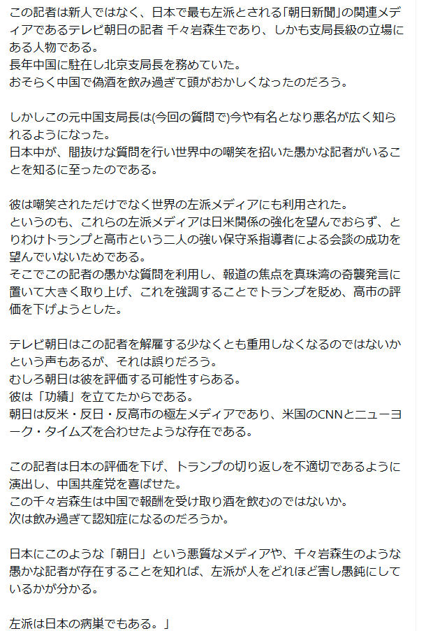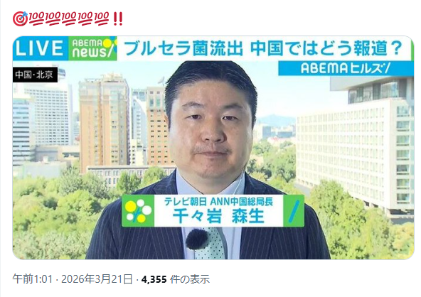 2026年3月21日 / 最終更新日 : 2026年3月21日 文明のターンテーブル ブログ 北京支局時代に偽酒を飲みすぎて頭がおかしくなったんだろう…どこの国でも記者は左派が多数を占め質の低いものが群れているようだ。 X コメントを残すメールアドレスが公開されることはありません。 ※ が付いている欄は必須項目ですコメント ※ 上の計算式の答えを入力してください 名前 メール サイト 次回のコメントで使用するためブラウザーに自分の名前、メールアドレス、サイトを保存する。 Δ