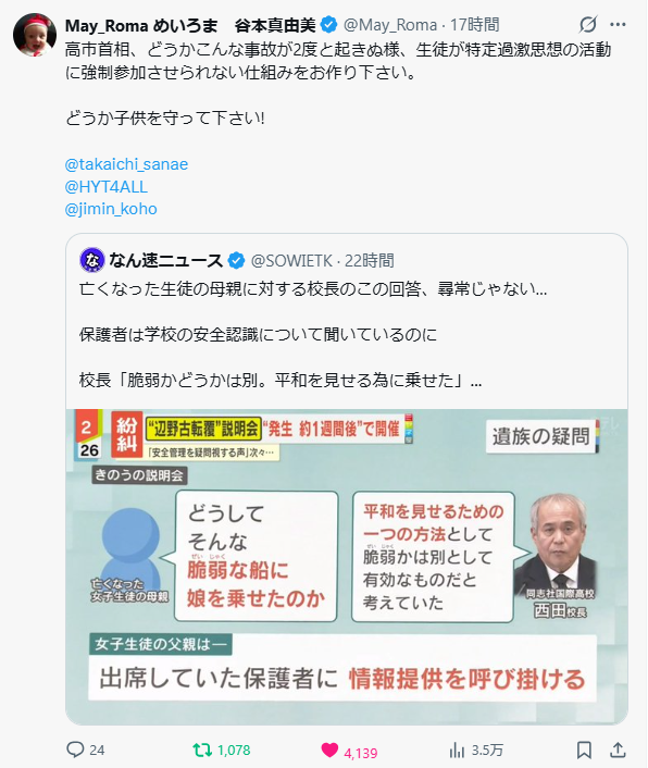 2026年3月26日 / 最終更新日 : 2026年3月26日 文明のターンテーブル ブログ 高市首相、どうかこんな事故が2度と起きぬ様、生徒が特定過激思想の活動に強制参加させられない仕組みをお作り下さい。 どうか子供を守って下さい! X コメントを残すメールアドレスが公開されることはありません。 ※ が付いている欄は必須項目ですコメント ※ 上の計算式の答えを入力してください 名前 メール サイト 次回のコメントで使用するためブラウザーに自分の名前、メールアドレス、サイトを保存する。 Δ
