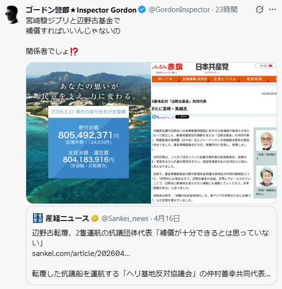 2026年4月18日 / 最終更新日 : 2026年4月18日 文明のターンテーブル ブログ 新基地反対「辺野古基金」共同代表 宮崎駿 …宮崎駿ジブリと辺野古基金で 補償すればいいんじゃないの… 関係者でしょ 宮崎駿ジブリと辺野古基金で 補償すればいいんじゃないの関係者でしょ X コメントを残すメールアドレスが公開されることはありません。 ※ が付いている欄は必須項目ですコメント ※ 上の計算式の答えを入力してください 名前 メール サイト 次回のコメントで使用するためブラウザーに自分の名前、メールアドレス、サイトを保存する。 Δ
