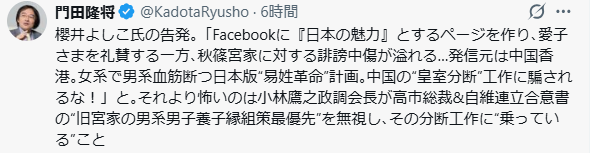 女系で男系血筋断つ日本版“易姓革命”計画。中国の“皇室分断”工作に騙されるな!」と。