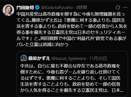 藤原かずえ氏は「悪魔に利する事よりも、国民生活を害する事よりも、政府を貶めて一部の信者から人気を得る事を優先する立憲民主党は日本のセキュリティホールです」と。
