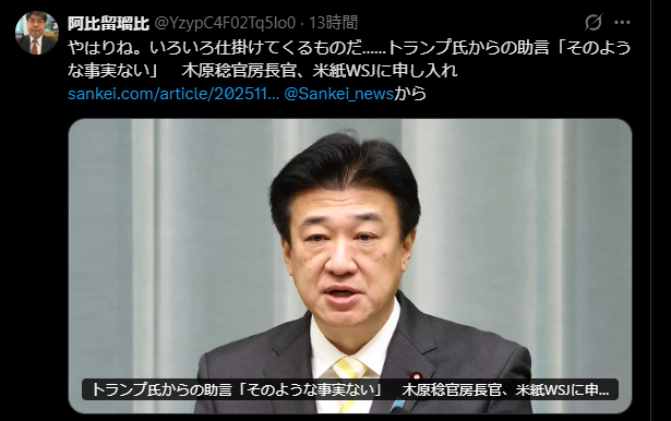 やはりね。いろいろ仕掛けてくるものだ……トランプ氏からの助言「そのような事実ない」 木原稔官房長官、米紙WSJに申し入れ https://sankei.com/article/20251127-NWL5SKPW4NMDDNDNWXRVYWN5VY/