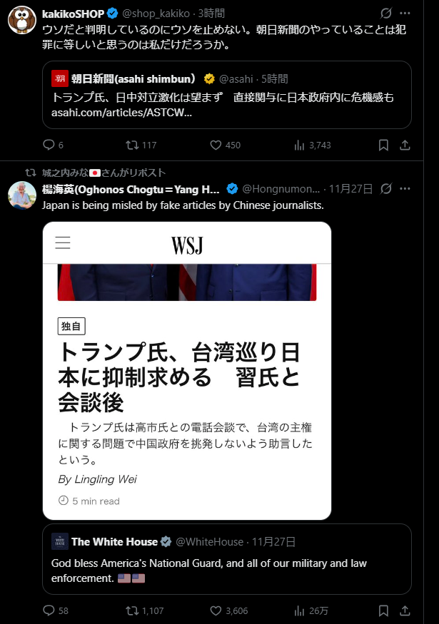 トランプ氏、日中対立激化は望まず 直接関与に日本政府内に危機感も https://asahi.com/articles/ASTCW41XPTCWUTFK00LM.html?ref=tw_asahi