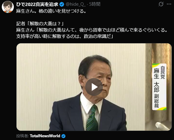 01/21/2026 / Last updated : 01/21/2026 文明のターンテーブル blog 解散の大義なんて、後から貨車で山ほど積んで来るぐらいくる。支持率が高い時に解散するのは、政治の常識だ。 麻生さん。格の違いを見せつける。記者「解散の大義は?」 麻生さん「解散の大義なんて、後から貨車で山ほど積んで来るぐらいくる。支持率が高い時に解散するのは、政治の常識だ」 FacebookXBlueskyHatenaCopy Leave a ReplyYour email address will not be published. Required fields are marked *Comment * Please enter the result of the calculation above. Name Email Website Save my name, email, and website in this browser for the next time I comment. Δ This site uses Akismet to reduce spam. Learn how your comment data is processed.